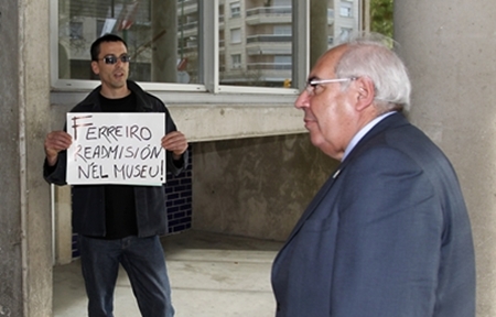 Momentu n'el que'l Presidente d'Asturies s'atopaba co'l cartelo que pidía la readmisión del Ferreiro. Na semella pequeña Pepe el Ferreiro.